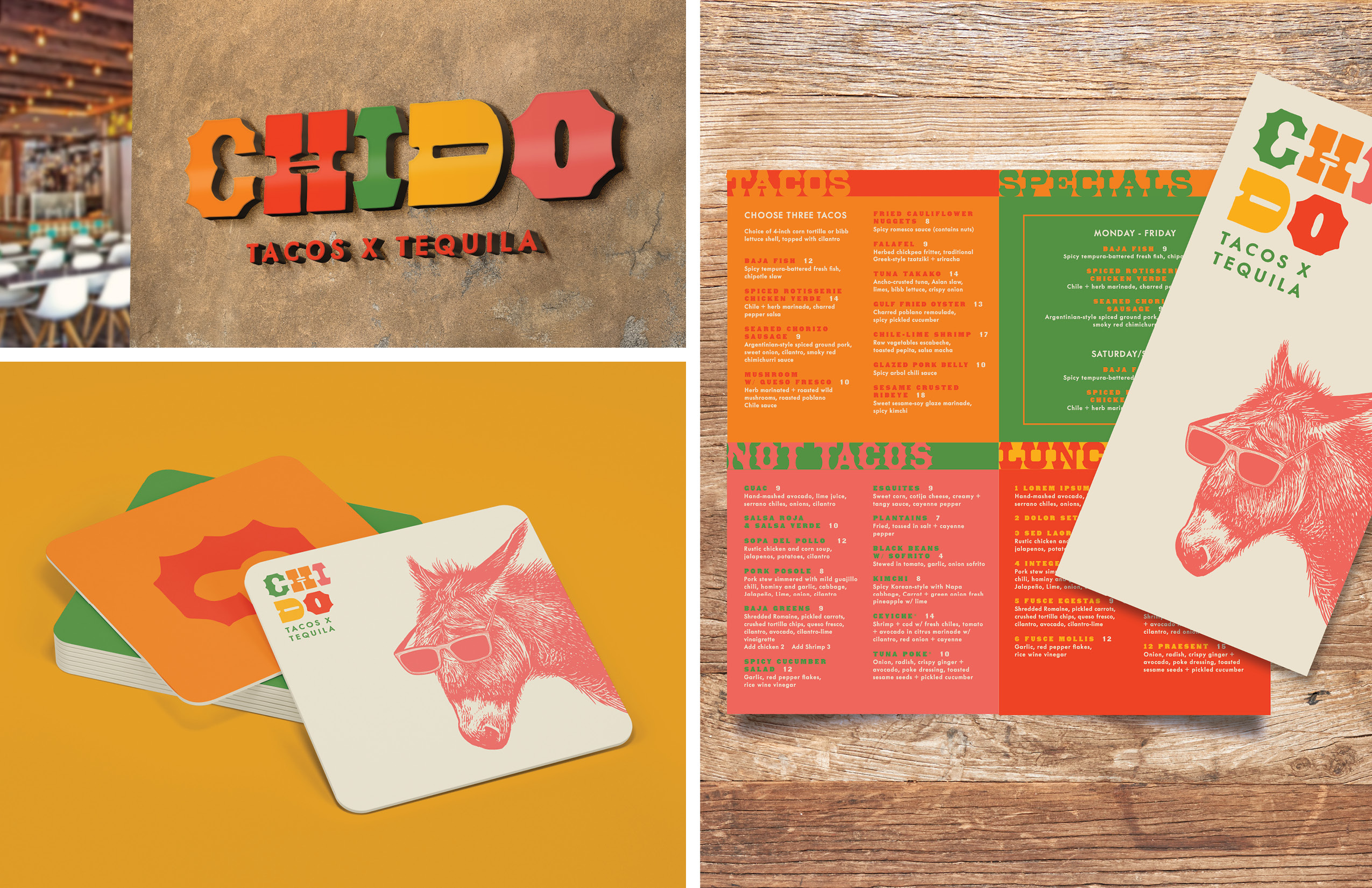 Branding and identity for a stylish, tequila-forward taqueria that blends traditional cuisine with modern culinary concepts. The identity package uses mixed woodblock type, bright vibrating colors and a “cool” mascot to create a fun and irreverent atmosphere.
