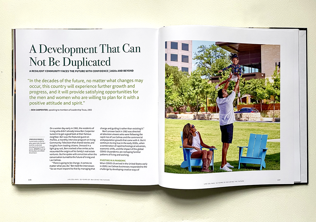 50th anniversary book for Las Colinas, Texas, that celebrates proper custodianship of the land from working ranch to visionary development.
