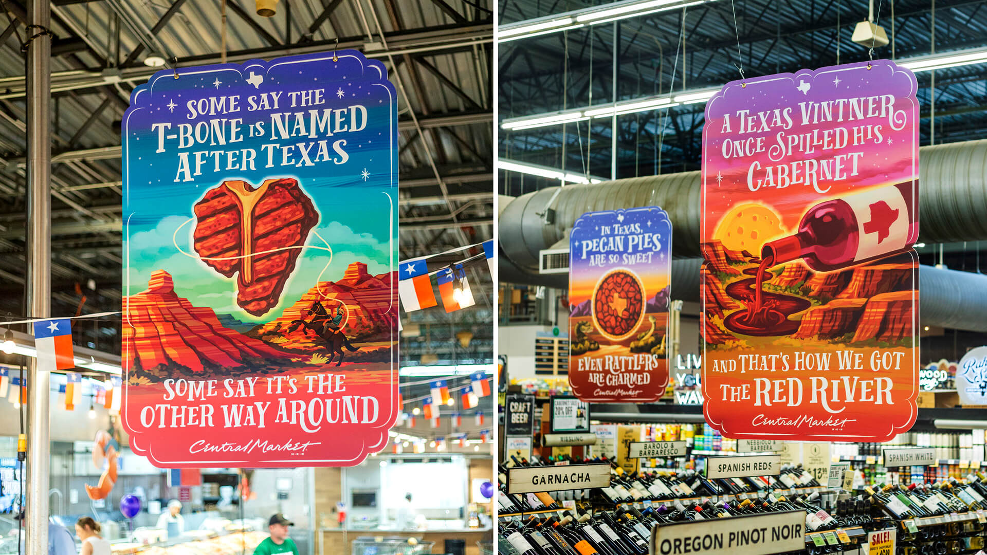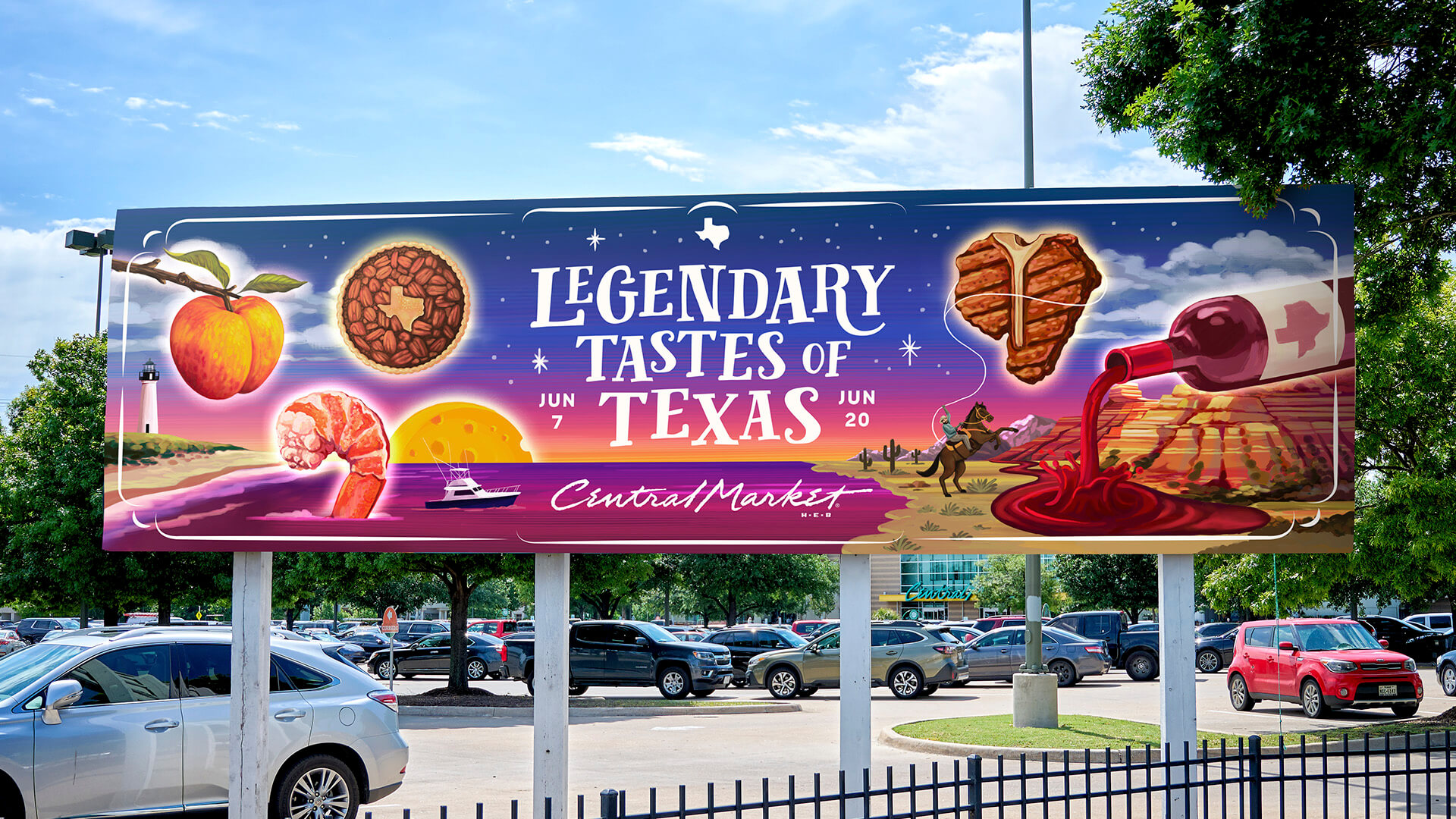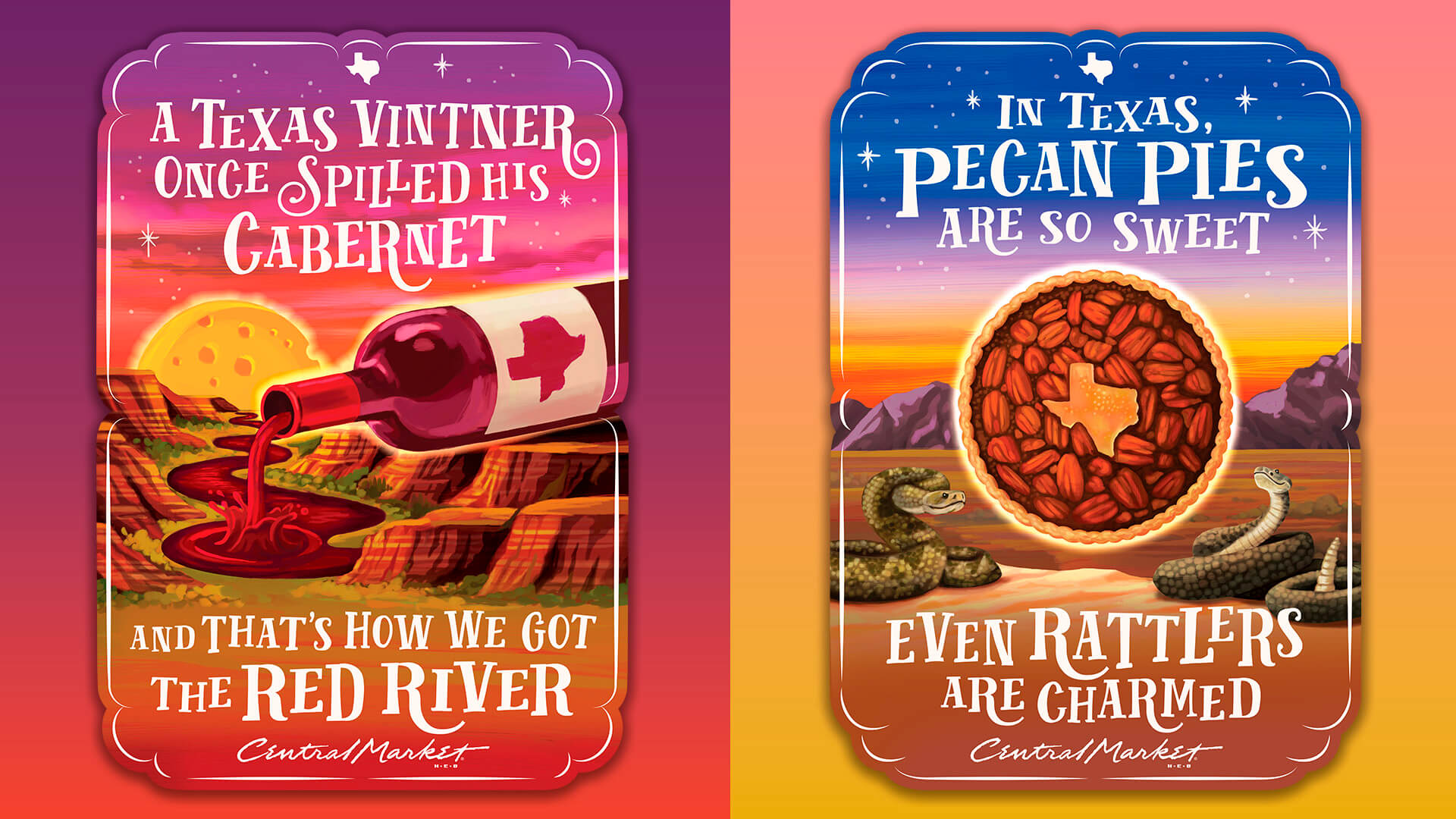 Central Market is a high-end grocery chain in Texas. For their Texas Festival, we created “the Legendary Tastes of Texas,” folk tales made from grand foods across the state. We paired these tales with fantastical visuals of the lone range and Texan products available.