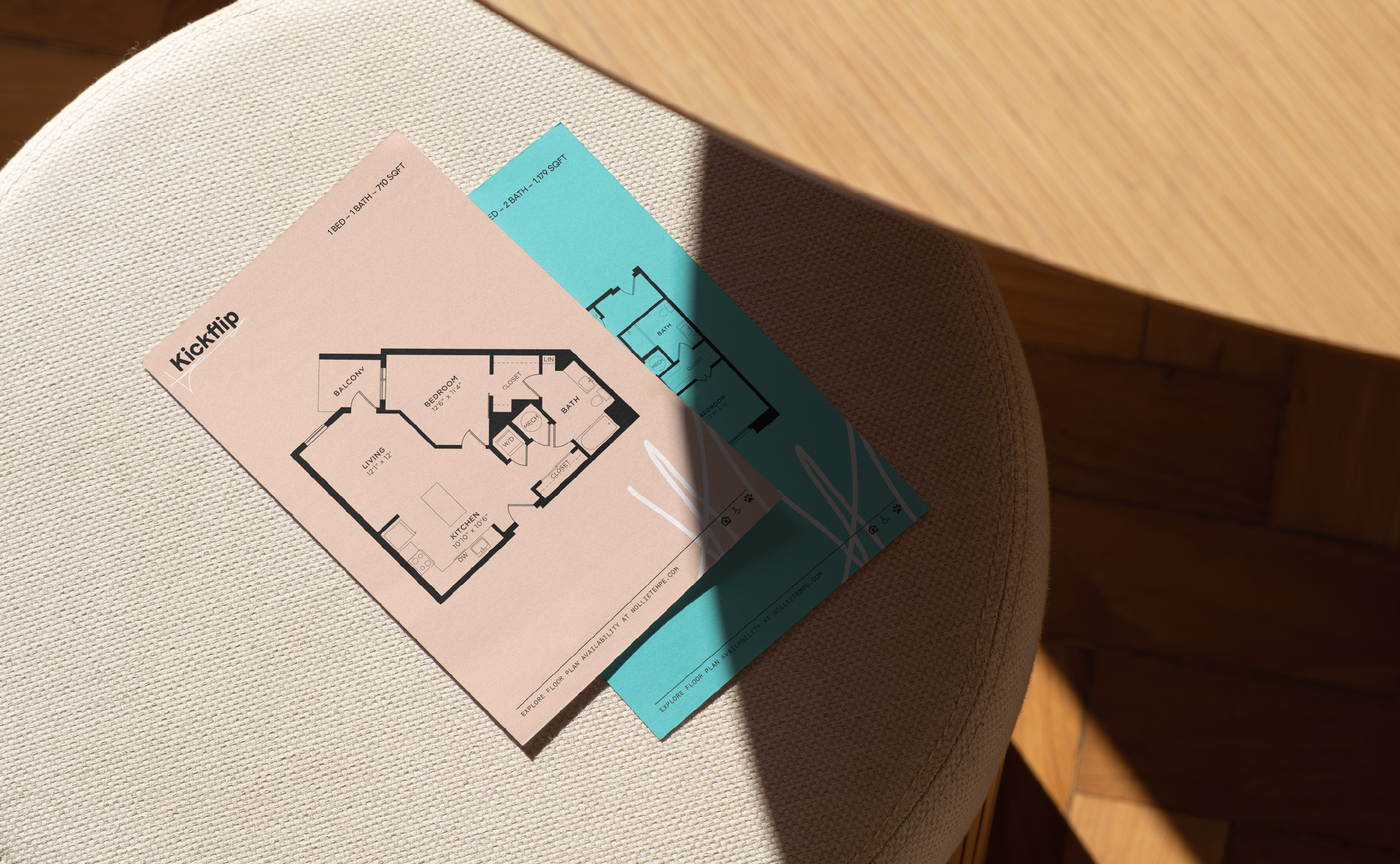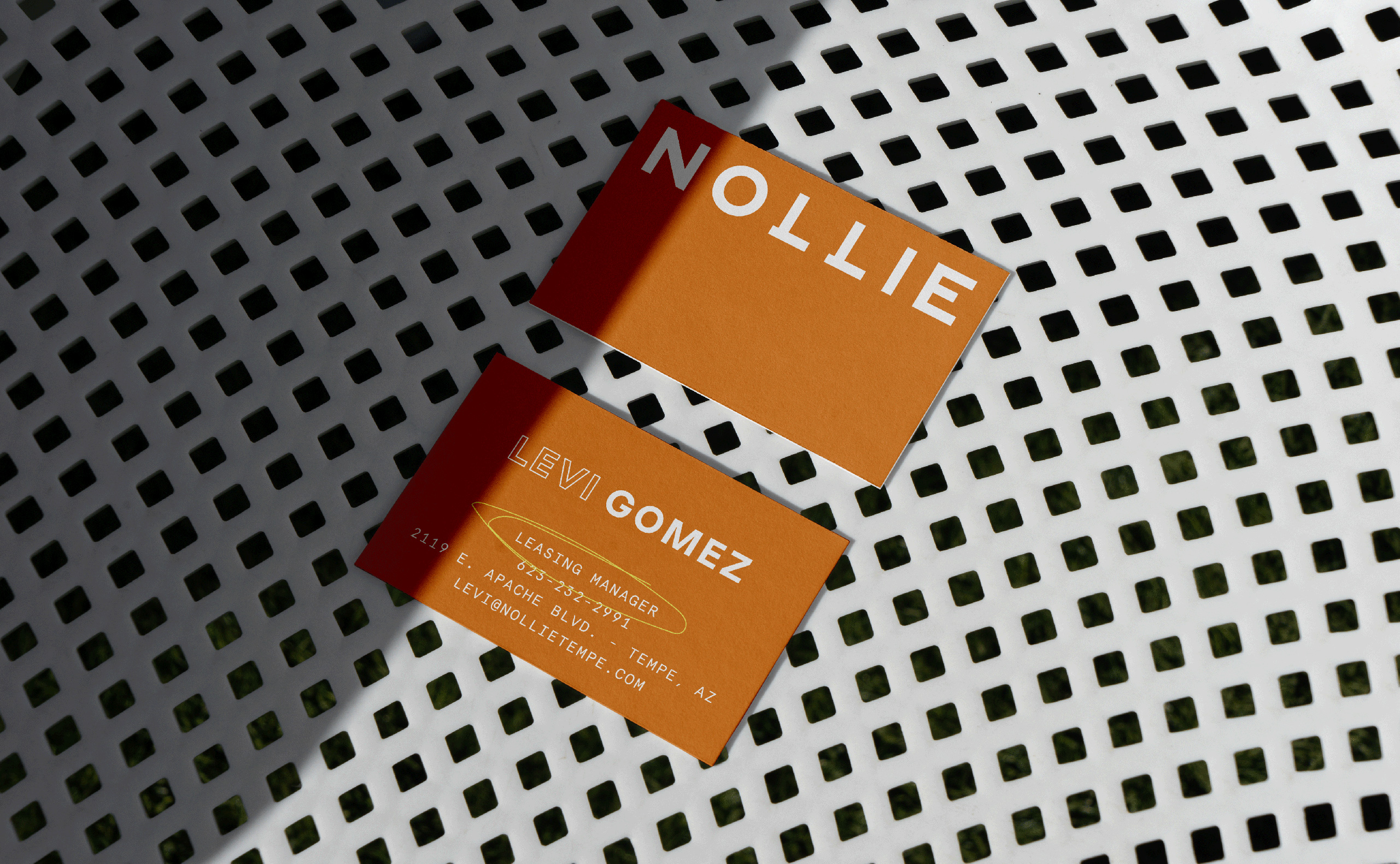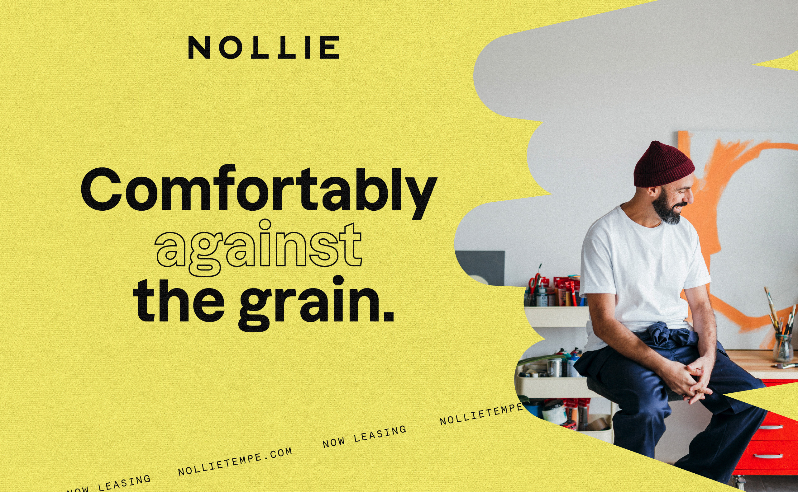 Nollie is a multifamily development in East Tempe located near a soft-industrial neighborhood. Everything from the wordmark to the colorful collages are energetic, edgy and highlight their unique community amenity of shareable skateboards and longboards.