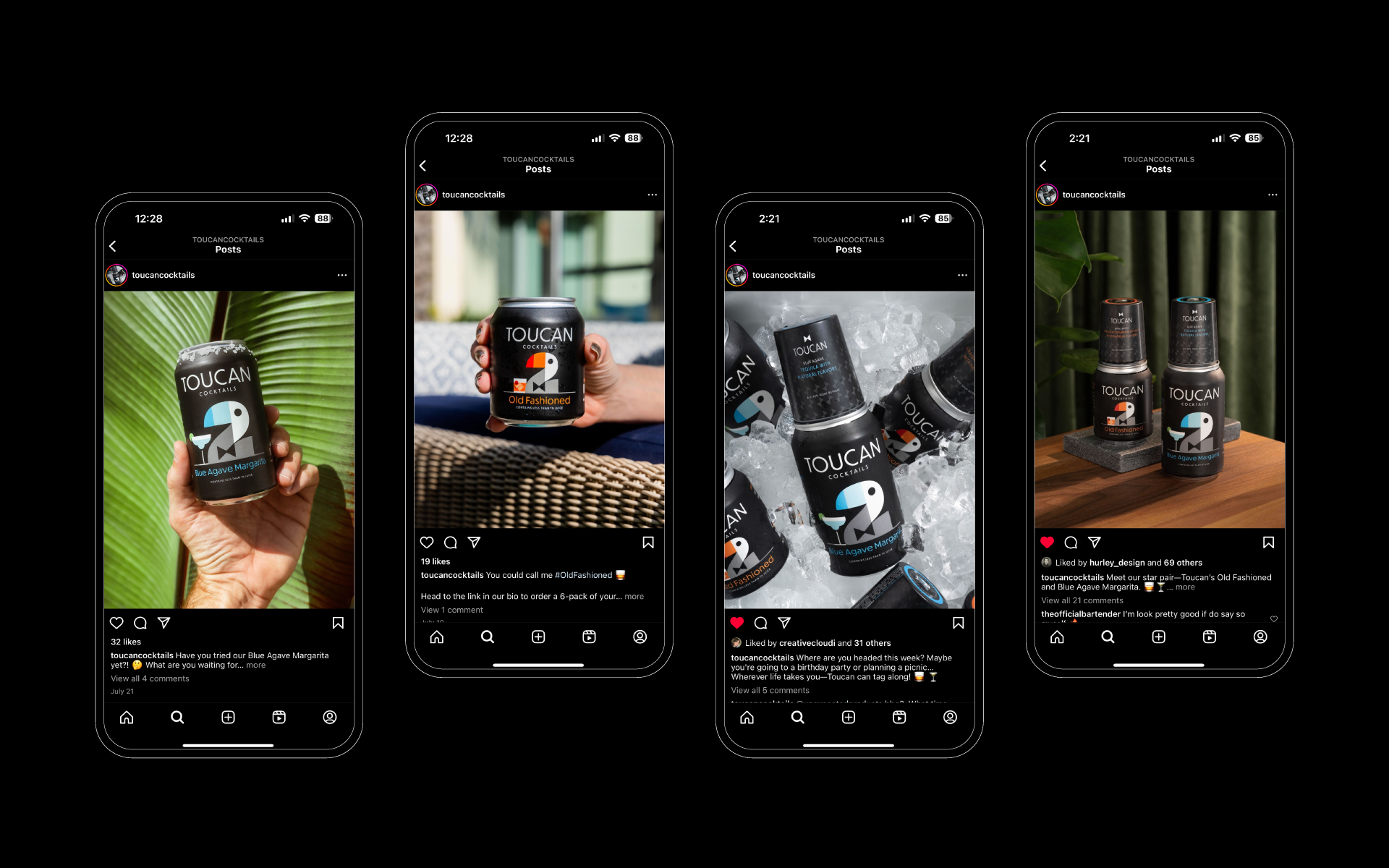 Toucan Classic Cocktails is a premium, portable cocktail using a patented two-can solution. From naming to logo design and packaging to social media, we developed a visual brand language to help educate consumers about this unique cocktail solution and help the brand take flight.