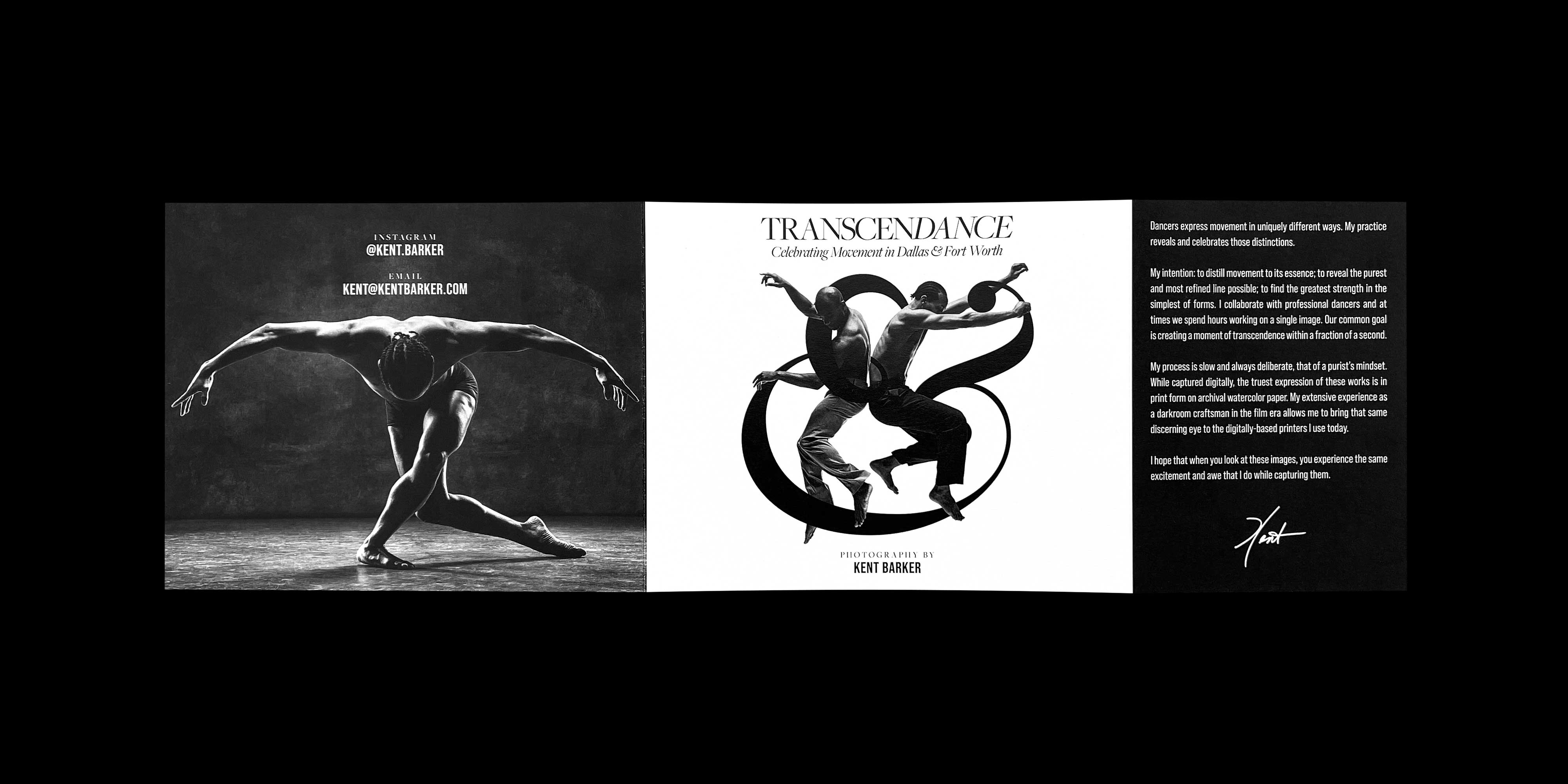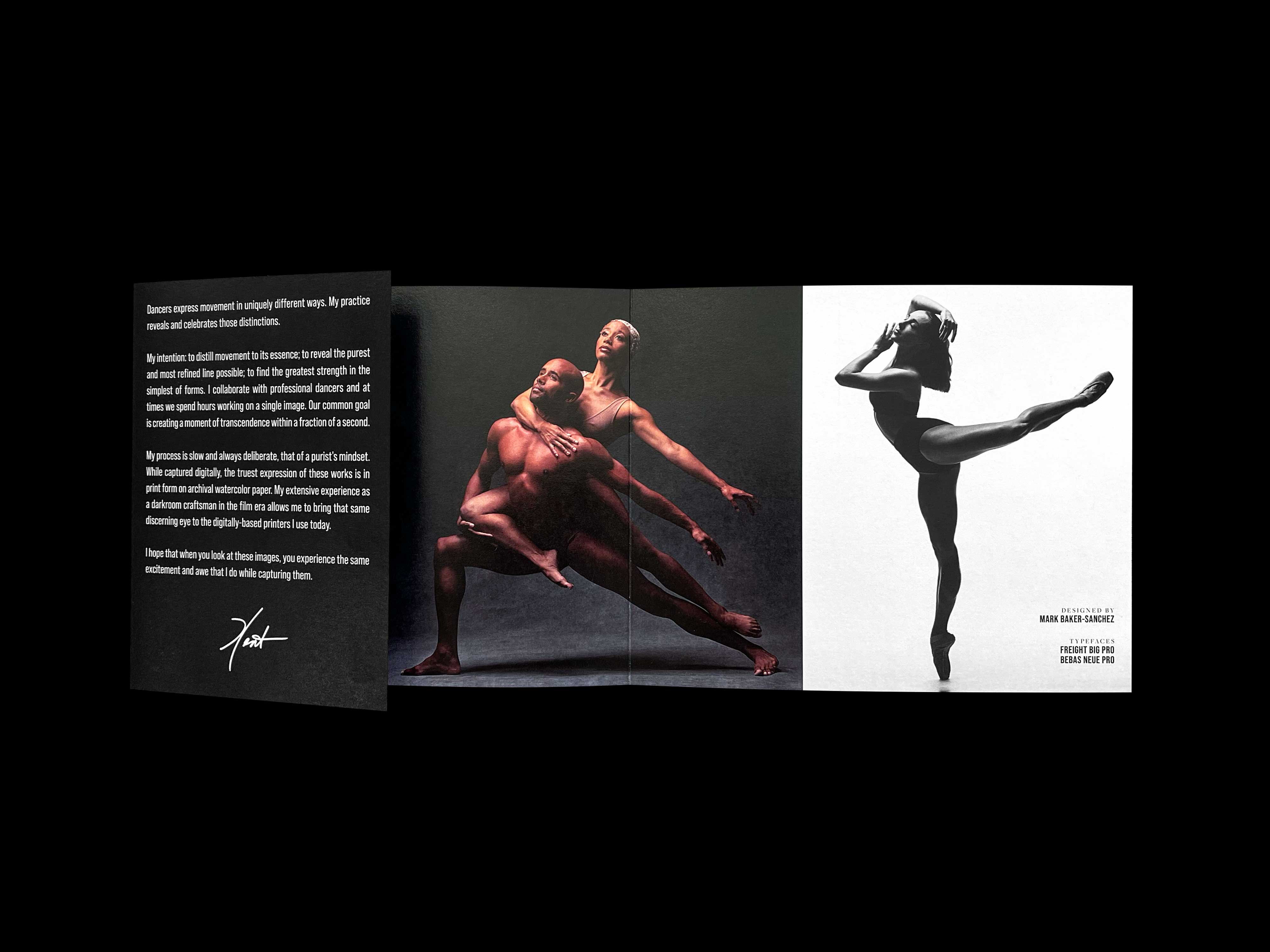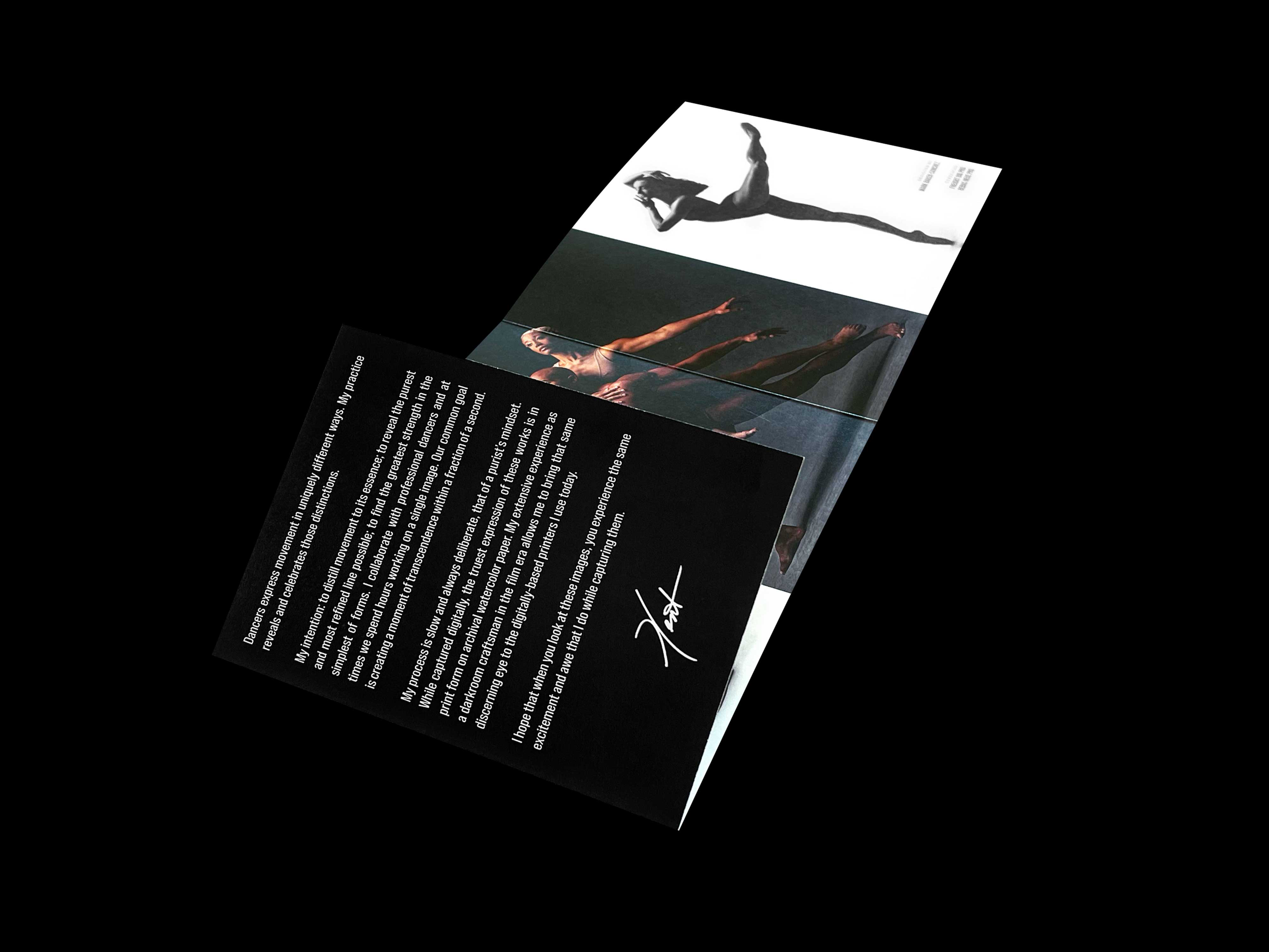 Kent was headed to the 2022 FotoFest Biennial and wanted a high-level printed piece that called attention to his dance imagery and would be something for interviewers to remember him by. This involved naming and designing a foldout that would later translate to his gallery show.