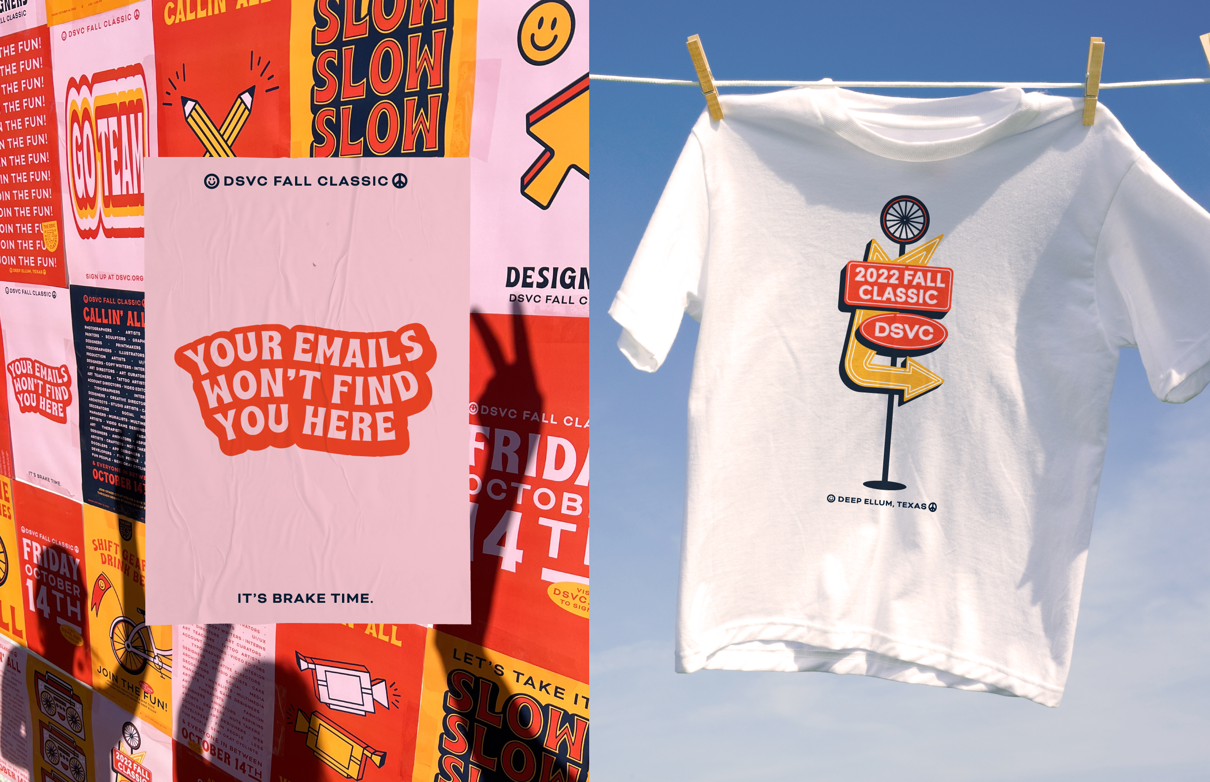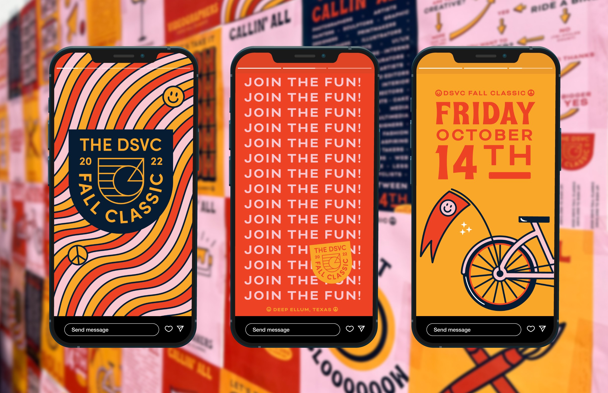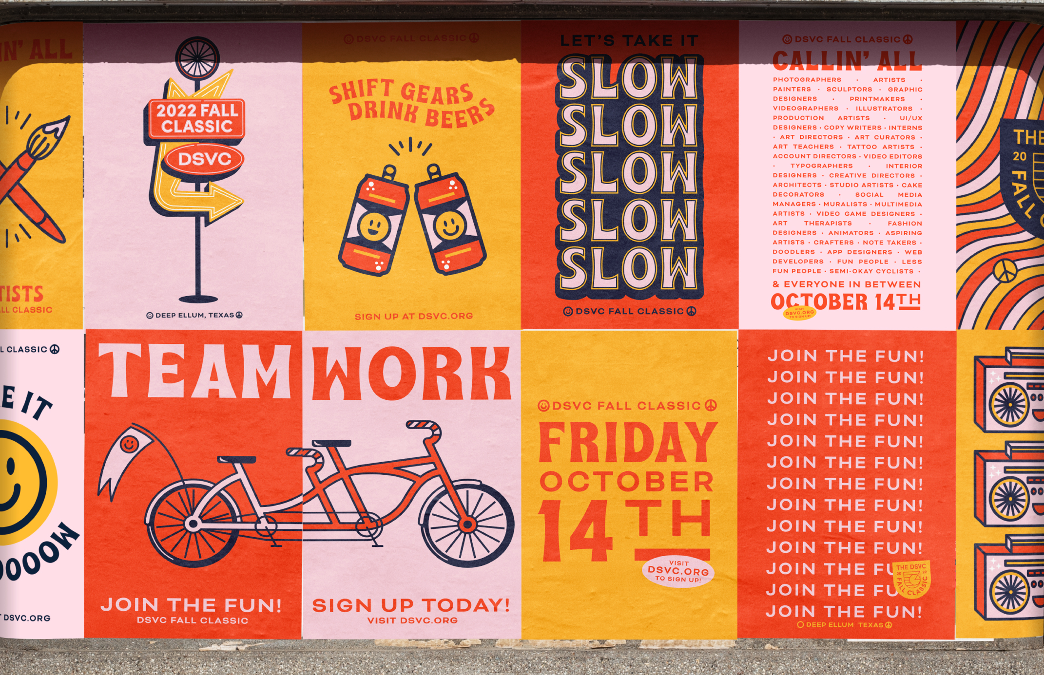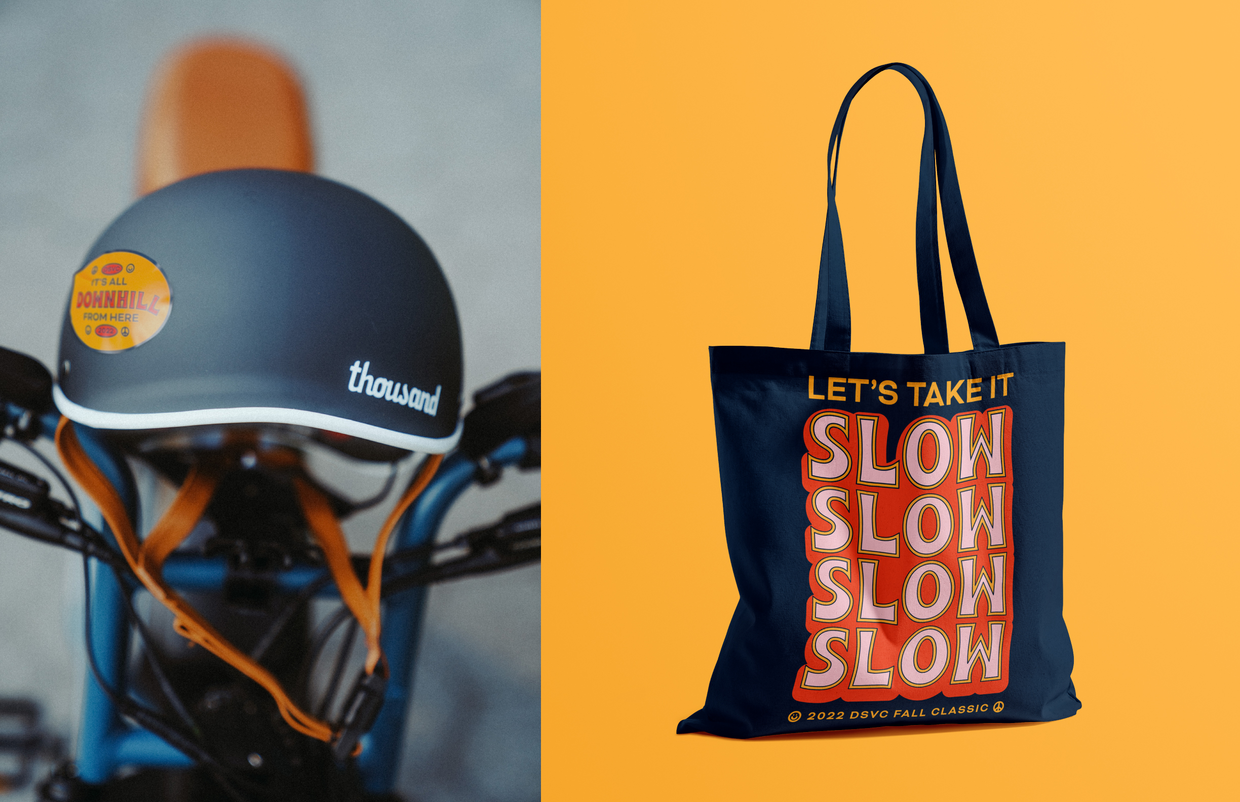 Rescheduled in wake of COVID, everyone was in need of a fun and groovy pick-me-up for the 2022 Fall Classic Bike Ride fundraiser. The event identity expresses this cheery sentiment through light-hearted writing, vibrant colors, and location-inspired graphic elements.