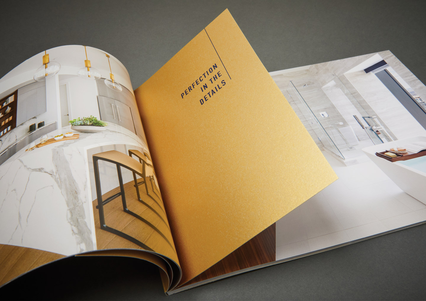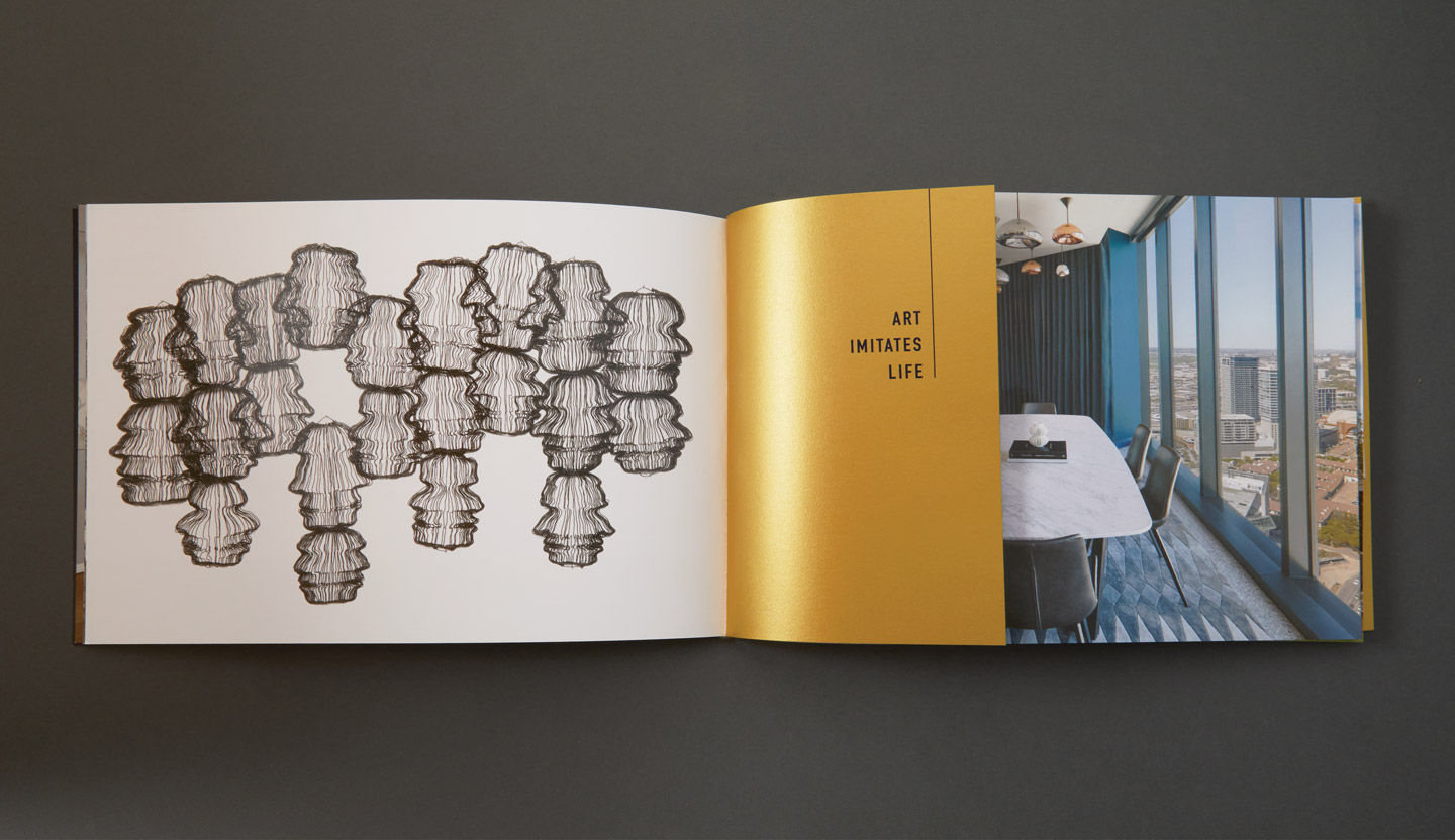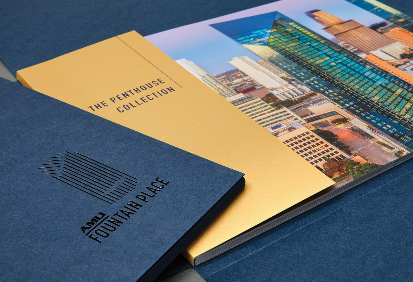Perfect bound brochure in quatro fold portfolio wrapper. A main theme of the property is the art collection, which is highlighted along with the penthouse apartment offerings, floor plans and site map.